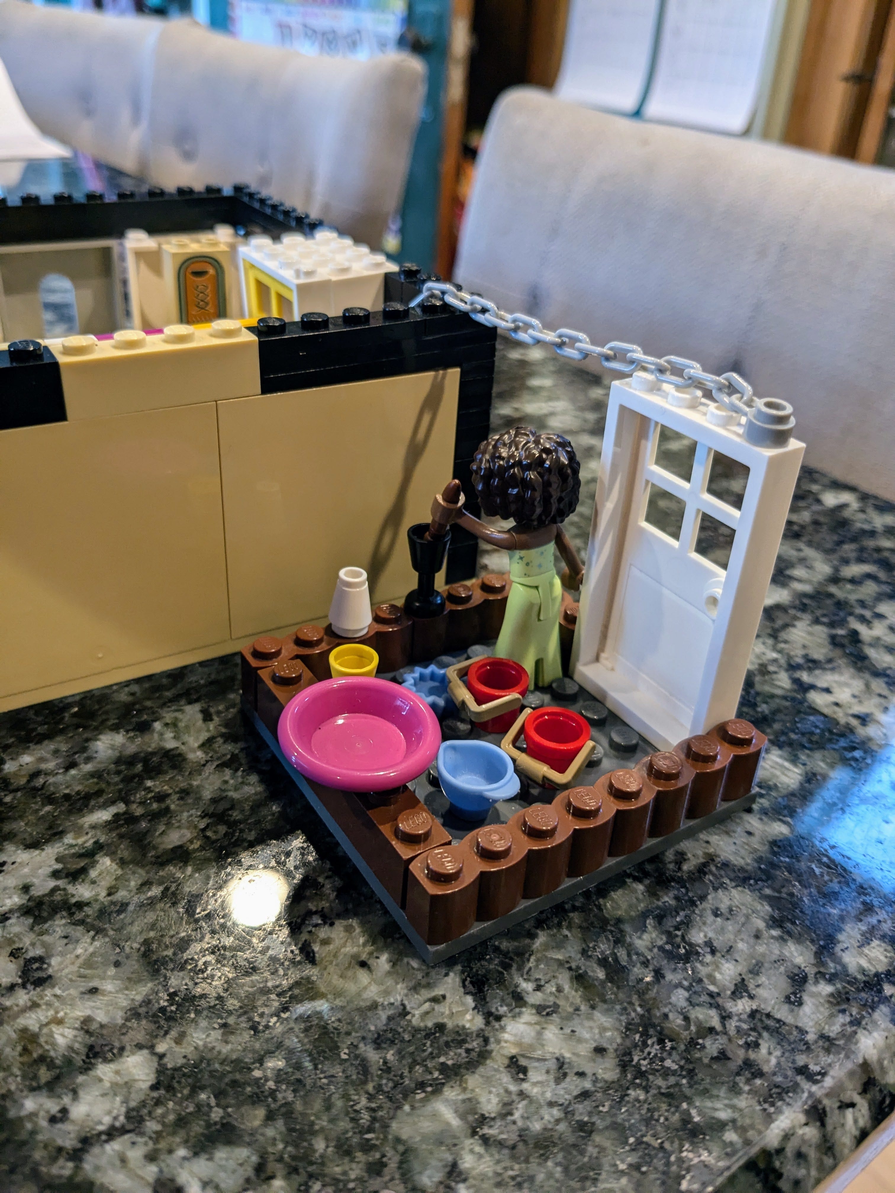 When we reached the chapter called “India Writes the Vedas,” Corinne squealed and had her Mona figure say, “That must be what this book we found was!” We learned about Hatshepsut’s expedition to Punt that brought back live Myrrh trees, so in went a plant on the small white table. Perhaps my favorite are the tan bricks seen above blending into the top right corner: those are some of the identical bricks found by British railway workers that led to the discovery of the Indus Valley civilization.